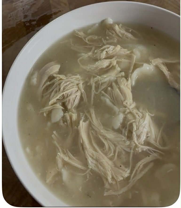 Savory Chicken with soft noodles in a hot, delicious broth.